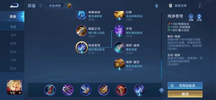 6、李信的出装即铭文:前期冷静之靴加荆棘护手,荆棘护手只是过渡,因为有物理攻击,线上对拼比较强,等装备卡格子的时候卖掉就好,这个装备价格还是挺便宜的。纯输出装备,唯一的“防具”就是纯净苍穹了,先手可以减速,提升后续伤害命中率,一旦被近身,开启苍穹后有机会反杀,不会因为一身输出装而秒躺,名刀司命也有这个功效,这套出装成型后,冷却会溢出,所以冷静之靴可以换成影忍之足,再次提升生存能力。