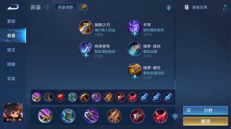 出装思路与打野时大体接近,核心装备依旧是暗影战斧和无尽战刃,是伤害成型的关键,发育路玩法不出打野刀的情况下,腾出来的位置可以出一件破晓或者碎星锤,根据对方阵容选择。