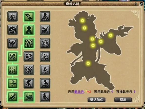 玩家最多激活12个经脉点,再把激活的经脉点连接起来,不同经脉点连接获得的技能是有区别的。
