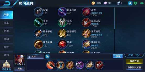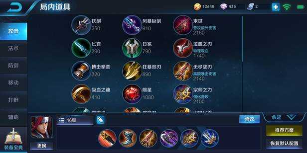韩信的装备还是非常常规的:红刀—攻速鞋—暴击刀—暗影战斧—宗师之力—破军