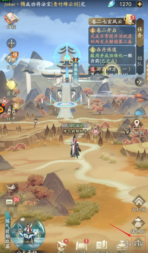 1、登录游戏,完成新手引导之后,回到游戏主界面,点击右下角的“箭头”,展开菜单。