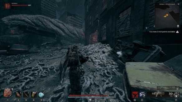 在右侧有一个小航点的建筑,沿着这条路走,直到你穿过桥下一个相当开阔的区域,几辆车停在在中间。
