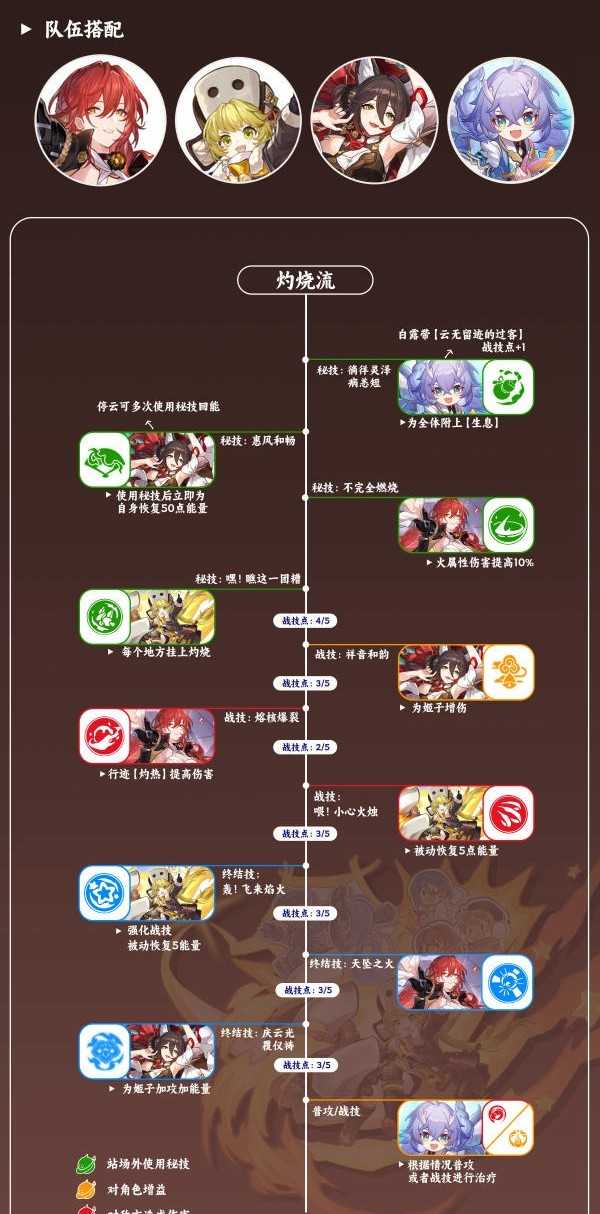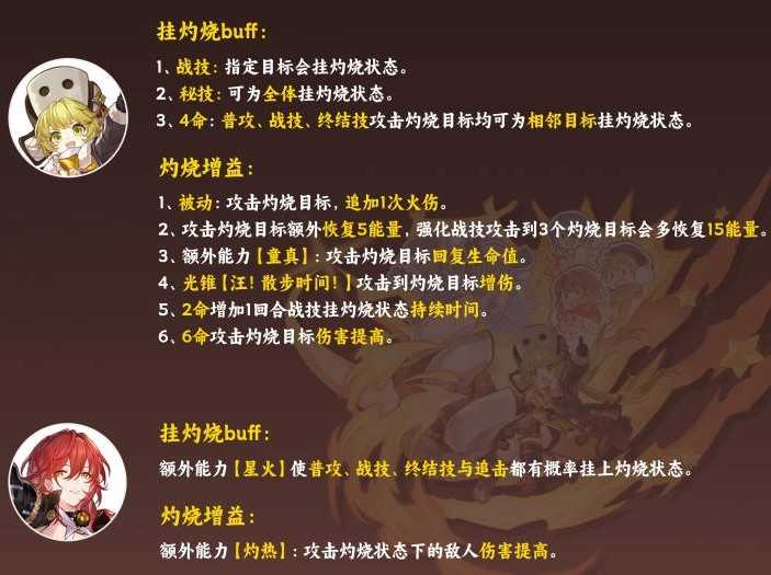 「虎克」依靠稳定的输出能力与优质的为敌方挂灼烧状态,与姬子可组成灼烧流玩法。这里我用一张图详细描述一下「虎克」与姬子挂灼烧以及灼烧带来的增益。