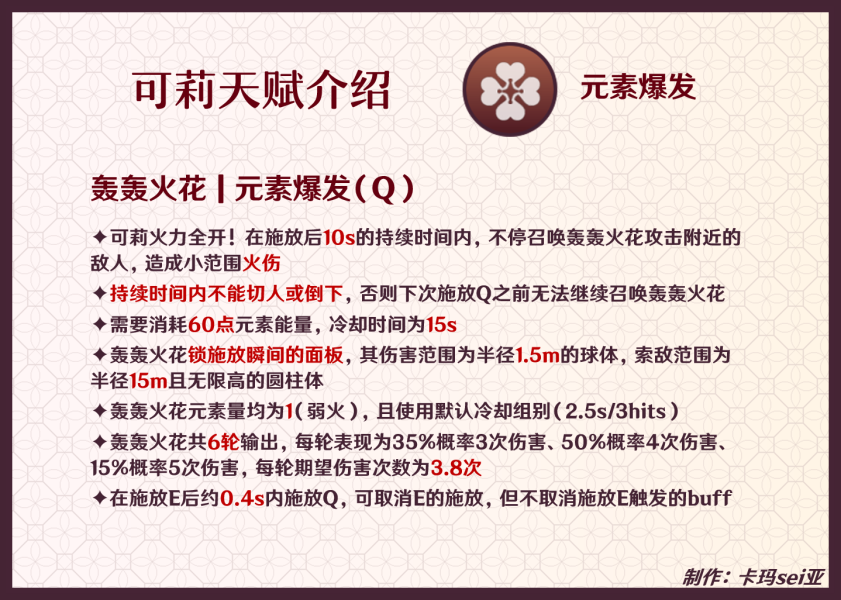 可莉的Q能带来命中率较高的高频火伤输出,且总倍率不低,是纯火流重要的输出来源,但需要可莉持续站场,灵活性不如E。仅推荐纯火流升级Q,且优先级至少低于A。(动图演示较长,已做倍速处理)