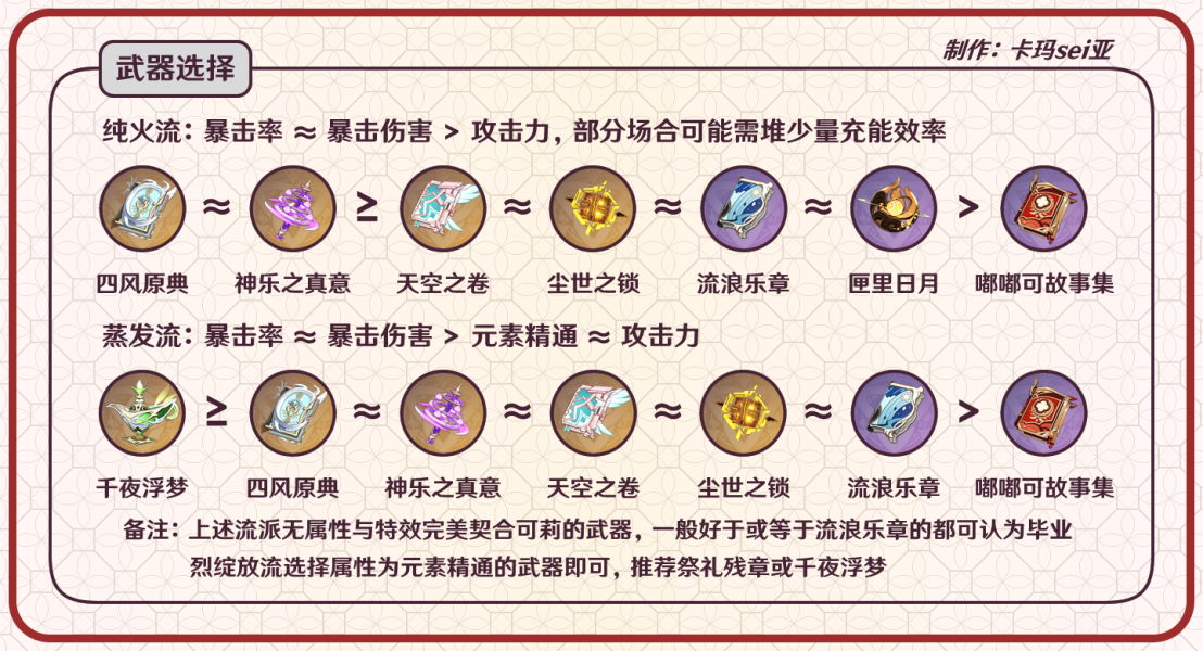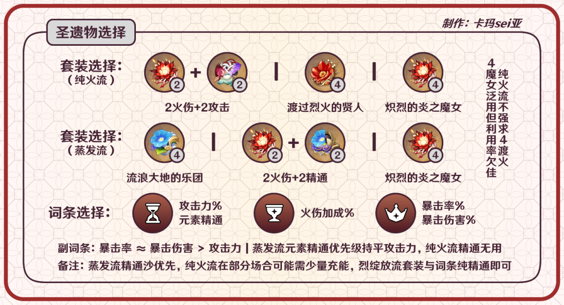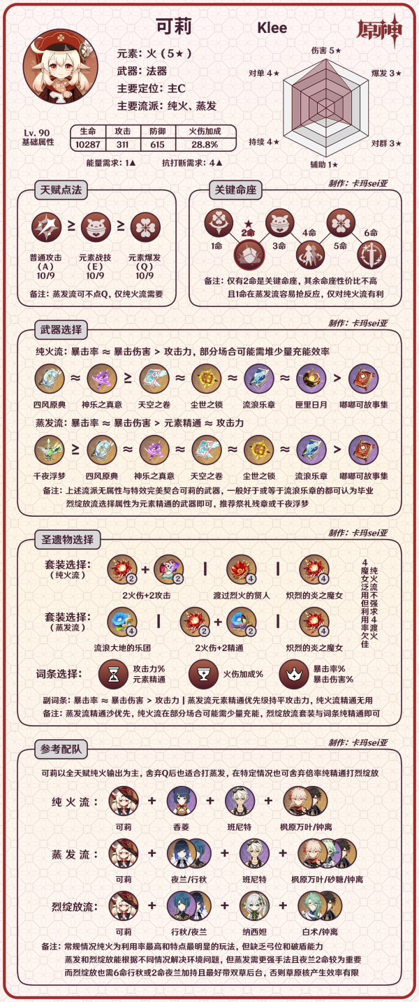 本篇根据各流派对可莉天赋的利用程度,分别介绍纯火流、蒸发流与烈绽放流。