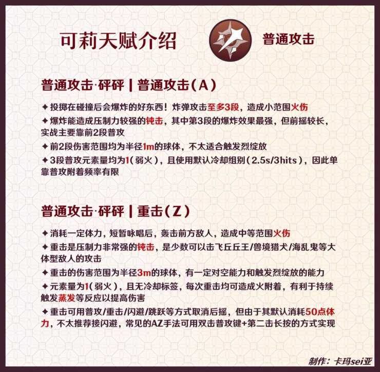 可莉的普攻(A)与重击(Z)倍率较高,且重击能受到固有天赋1加持,是相对最为重要的直伤输出来源,因此升级优先级最高,但纯火流可莉的每个天赋都有重要输出,需要注意兼顾。
