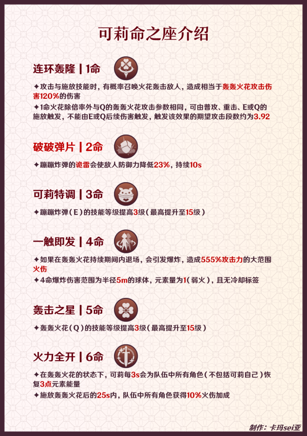 可莉是以站场持续伤害为主的火系输出角色(主C),具有很强的挂火能力与压制力,在部分场合也不乏爆发能力。