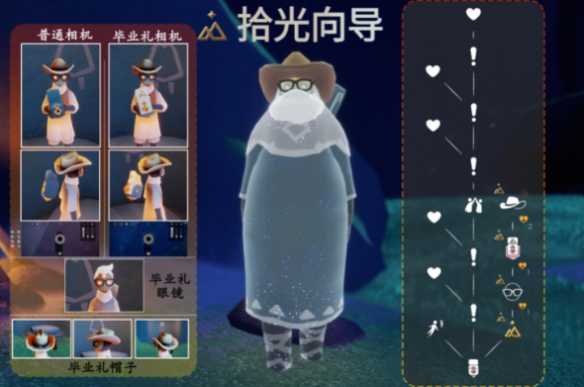 “毕业礼相机”的功能与普通相机是差不多的,不过它在颜色样貌上做出了一点改变,该相机的获取方式就有一点复杂了,需要玩家兑换完四个毕业先祖的物品,才能去云野找到向导先祖兑换(支持蜡烛/爱心兑换)。