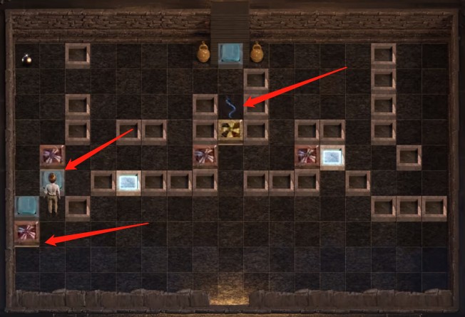 古庙第七关攻略1、玩家先将蓝色方块向上推,然后再将红白色方块向右推。