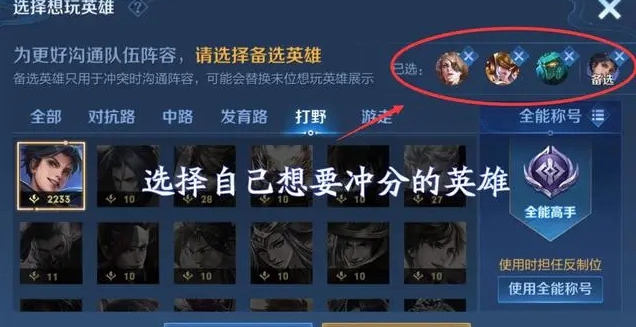 王者荣耀战力刷取教程1、确定常玩分路英雄:首先第一点就是得在开局前选好我们想要玩以及可以补位的英雄。