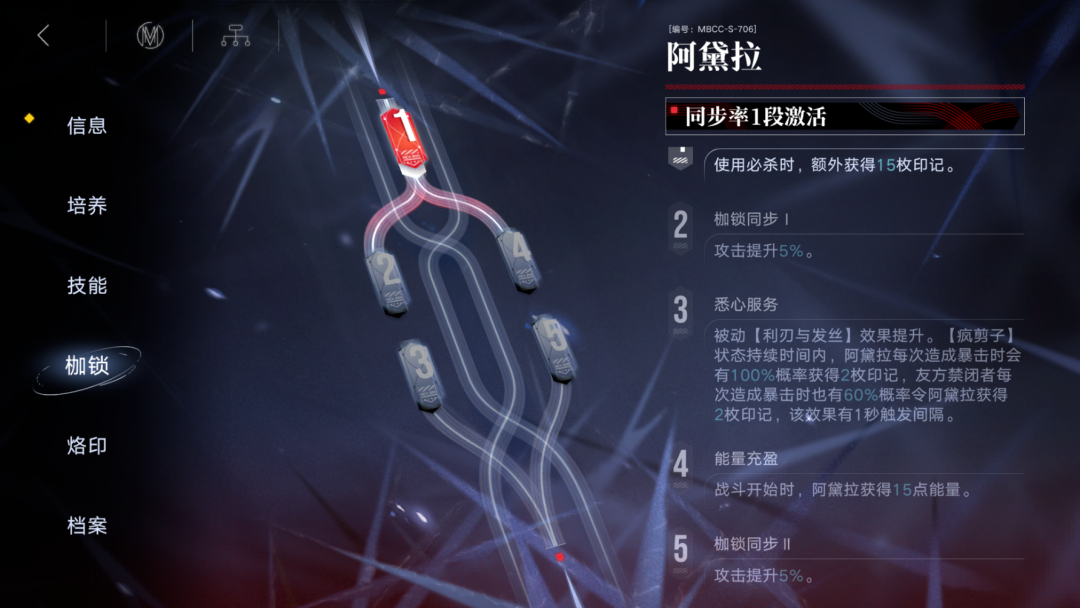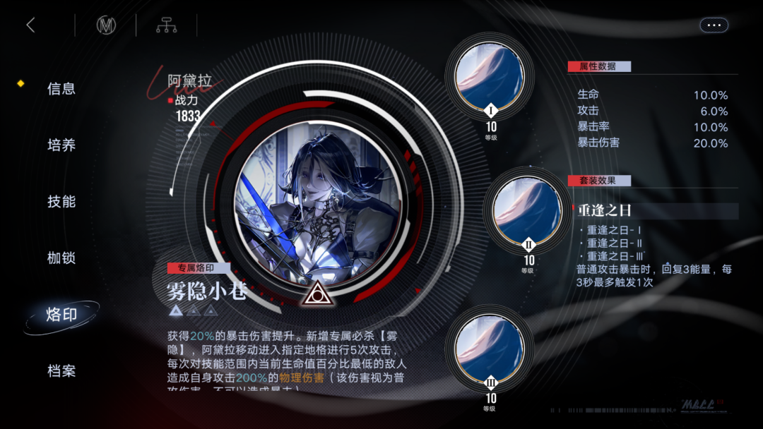 阿黛拉是一位具有不俗输出能力的单体暴击队主C,不过论综合爆发能力肯定还是要略逊于导演一筹,针对暂时还没有导演的玩家可以考虑将其作为主C使用,此外如果大家已经有了导演,那么同时上导演和阿黛拉也是未尝不可的选择;外加大招的九宫格范围破核能力与专烙的爆发辅助,阿黛拉在各类副本中的综合能力也是相对平衡的,烙印搭配优选【重逢之日】和【混沌之拥】,此外短图也可以考虑能量套。