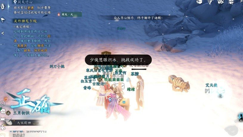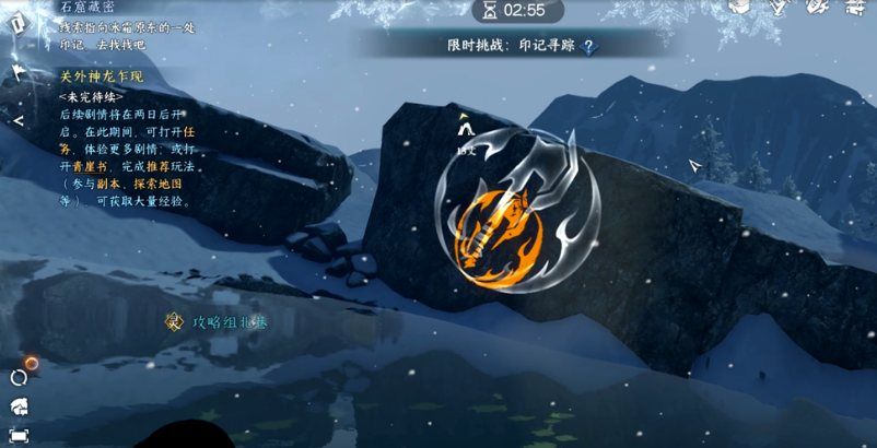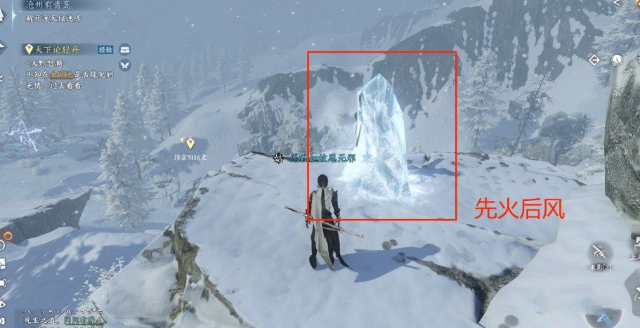 7、玩家完成后前往(1005,1026),等待第二次暴风雪来袭,让风把你吹到后面的石头上再回到任务点,再靠近石头即可触发任务。