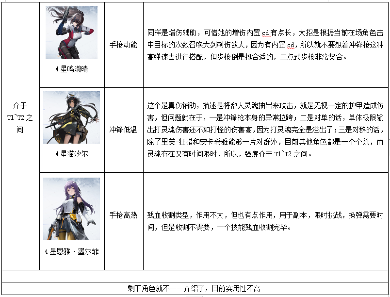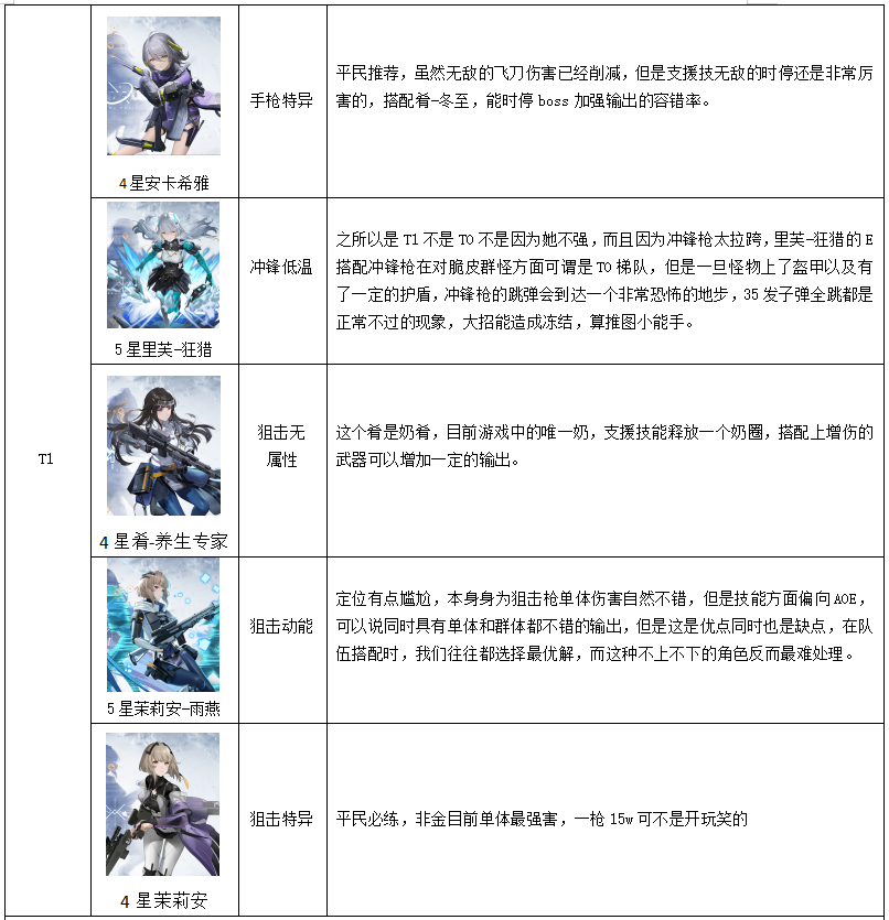 从武器选择来看,如果你是手机端的话,建议冲锋枪/步枪=狙击>霰弹>手枪,由于手机端的瞄准硬伤,狙击在面对大量飞行小怪时,手机端操作会很辛苦,而上手简单的冲锋枪、步枪在手机端内可以发挥很大的作用,PC端建议直接入手肴,养成后一枪一个小朋友,里芙狂猎如果打算抽取一命的话,也十分建议选择,对群伤害优秀。