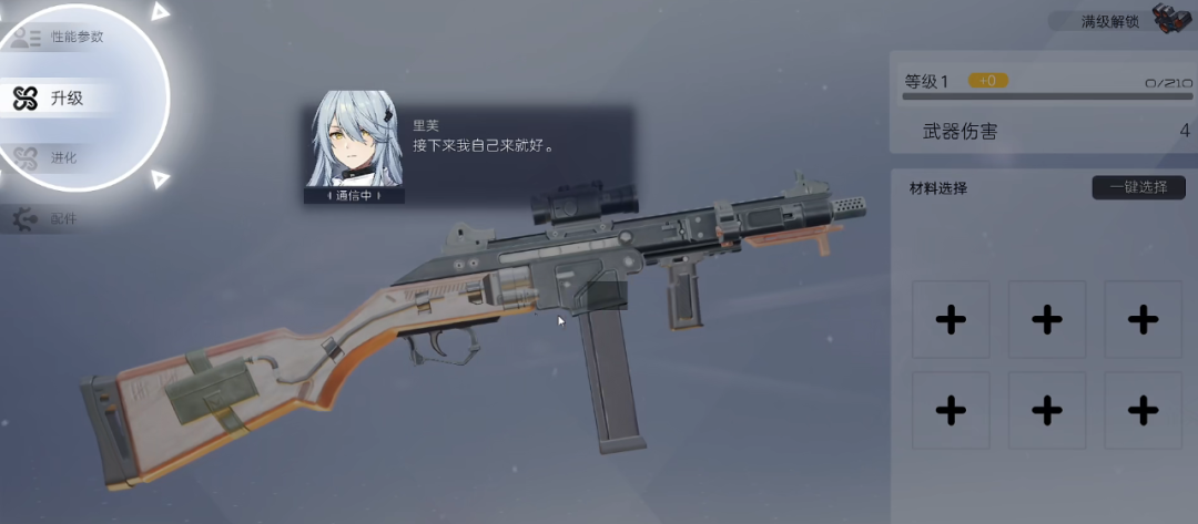 每一位角色在刚刚解锁时手中的枪械都是最普通的,没有特殊子弹也没有特殊配件。玩家可以通过副本或者主线多次反复的刷取材料,其中就会包含枪托或者握把等枪的零部件。武器的进化和装备配件是变提高角色战斗力的关键,在进化模式中可以更换更高品质的武器,或者携带战术面罩手柄。这类的装备自由度比较高,怎么改装全看玩家自行选择,可能将角色优点发挥到极致,也可以让角色更加均衡。