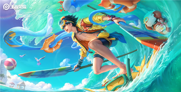 皮肤的特效为蓝色为主适当的加入了一些夏日海滩的元素,比如被动火焰变成了水滴,攻击后也会有水泡溅出,大招则是将游泳圈丢出去等。