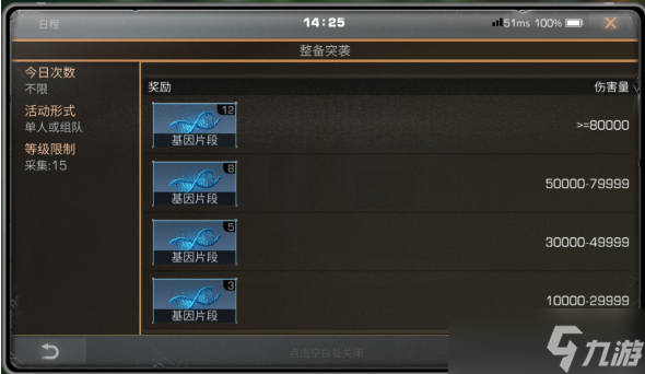 整备突袭与不明生物玩法类似,都可以获得基因样本。伤害量越高,所获得的基因片段越多。当伤害大于等于80000时,即可获得12个基因片段。