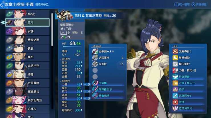 本作最强物理大爹,没有之一,其被动技能光彩夺目决定了刀刀必中,哪怕打50难度180+回避的敌人,也基本不会空刀。技巧速度双重补正决定了他是个高回避高暴击的角色。后期打上克制重装书没有人能在他的回合下存活。