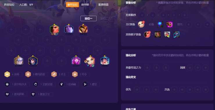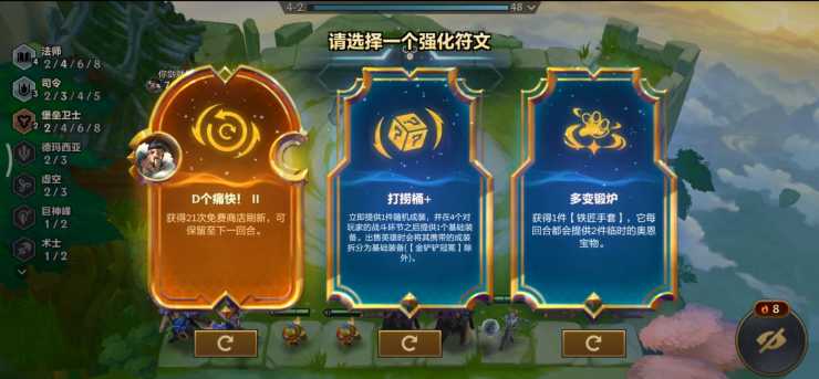 前期有维斯因的话,可以做一件两防御装备,锁血会更稳。到七人口之后,要是你血量非常高,就不急着刷牌,等到八人口之后,第三个强化符文也到来了,这时候拿德莱文英雄之力可以获得大量的免费刷新机会。