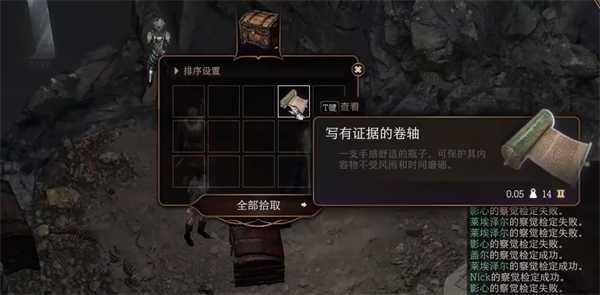 3、这个箱子可以直接使用撬锁进行打开会在里面获取一些金币、一个法术卷轴、一个戒指和一个笔记。
