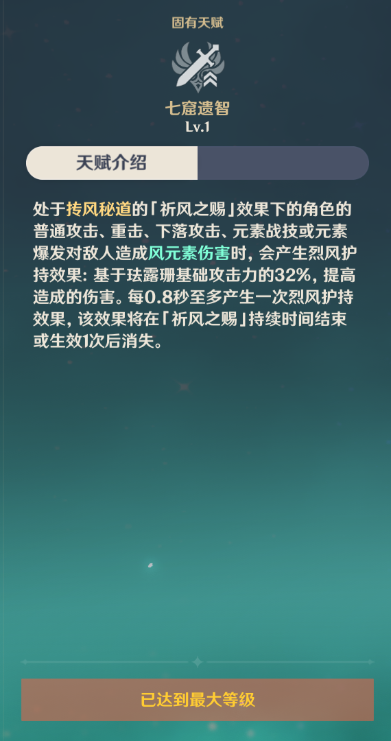 在珐露珊释放元素爆发后为队伍中的角色添加「祈风之赐」效果时,如果该角色对敌人造成风元素伤害,则会根据珐露珊基础攻击力的32%,提高造成的伤害。该效果每0.8秒最多产生一次,该效果会在「祈风之赐」效果结束后或者生效一次后消失。