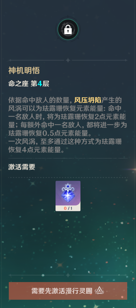 根据「风压塌陷」命中敌人的数量,为珐露珊恢复元素能量,至多回复4点元素能量。珐露珊的元素爆发需要80点元素能量,在实战中较缺充能,而四命的效果可以优化珐露珊的充能,让珐露珊能够更快更稳的开出元素爆发。