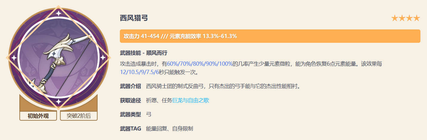 西风猎弓能够提供高额元素充能效率,并且副词条在暴击时产球,进一步优化珐露珊的充能,是十分契合珐露珊的一把武器。