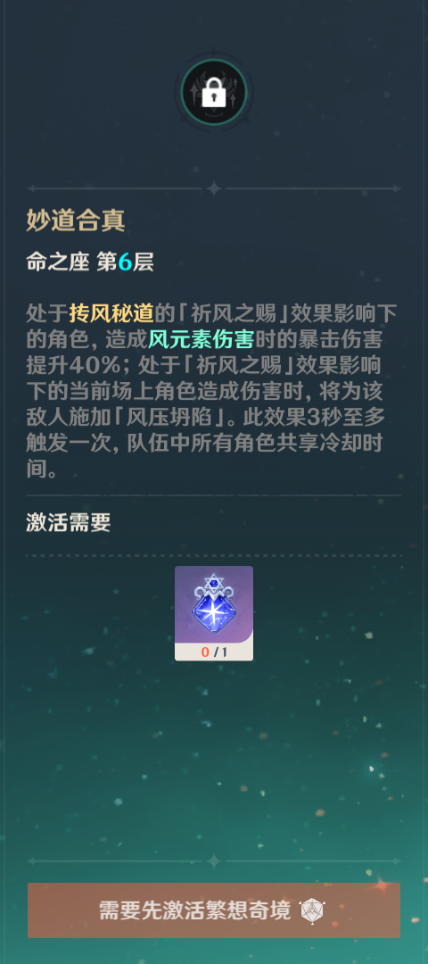 六命在处于「祈风之赐」的角色增加40%的风元素暴击伤害,且处于「祈风之赐」的角色进行攻击时,能够产生「风压塌陷」,冷却时间为3秒