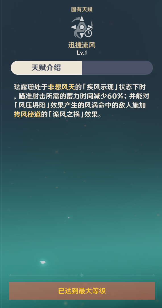 在珐露珊使用元素战技之后,下一次的蓄力攻击蓄力时间减少60%,并对「风压塌陷」命中的敌人添加「诡风之祸」的状态,降低敌人的风元素抗性。