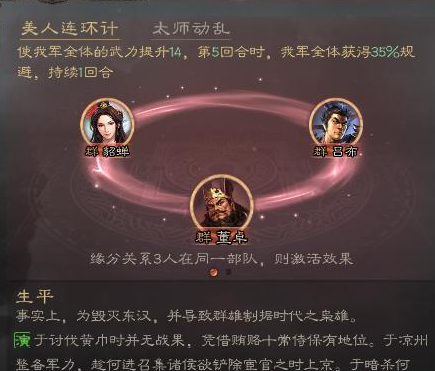因此队友选择吕布,貂蝉激活武将缘分”美人连环计“使得全体提升14点武力值并在第五回合提高35%的规避效果。