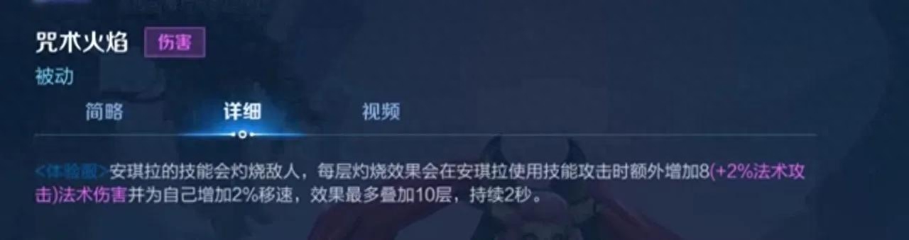 每层灼烧效果的具体伤害是:11+1×Lv+2%ap加成,也就是说10层被动时,安琪拉的每次技能伤害会附加250+20%ap的法术伤害。