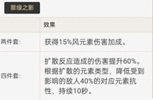 由此看出,万叶主要是提升元素精通属性。这个增伤再加上【翠绿】圣遗物的40%减抗,至少可以给主C提升60%以上元素伤害。