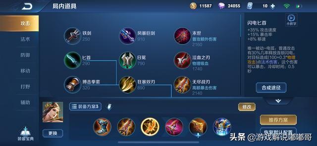 出装思路:因为虞姬的主要伤害来源于平A,所以比较依赖攻速,这套出装不仅大大的增加了虞姬的攻击速度,并且依靠破晓和末世这两件装备的被动,打起坦克类英雄也不至于那么费劲,并且还可以帮追虞姬增加续航能力。