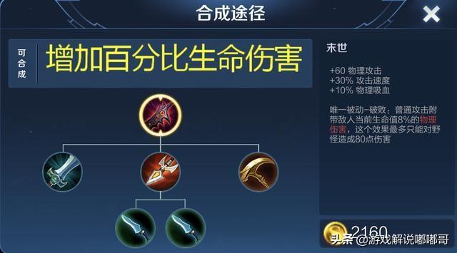 复活甲换掉之后可以换成末世,因为末世这件装备的被动,技能普攻可以对敌人造成生命值百分比的伤害,并且还可以为虞姬提供10%的物理吸血,很多玩家会说为什么最后不出名刀司命,其实名刀不是太适合她,因为二技能已经可以免疫物理伤害,免疫时间要远大于名刀的效果,所以不如直接补一件攻击装。