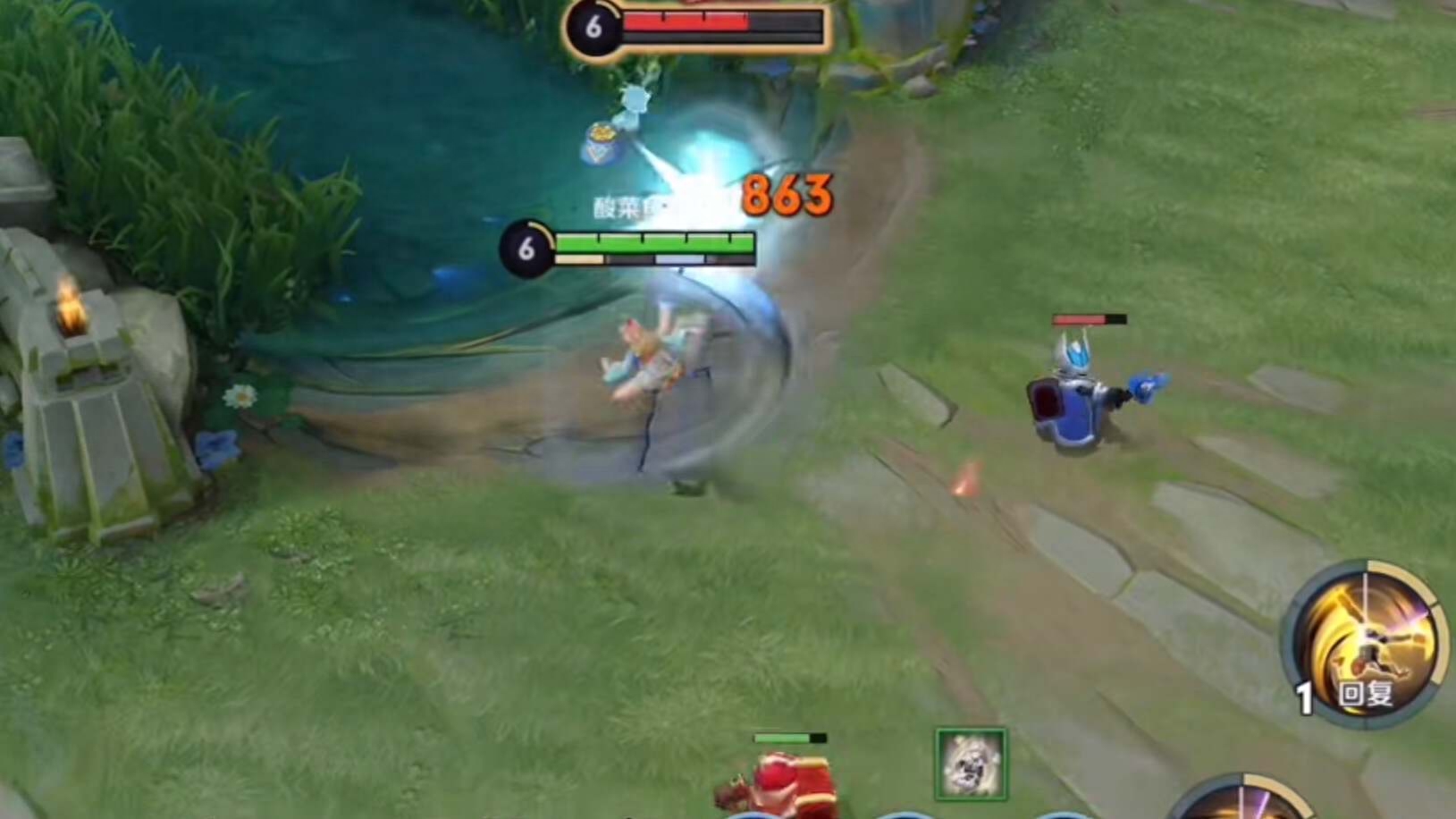 亚瑟二技能在前期是非常恐怖的,这个伤害一般的战士英雄都受不了,如果遇到这种一级持续输出非常强的英雄时,那么建议可以猥琐一波。