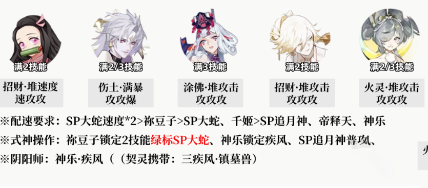 配速要求SP大蛇速度*2>祢豆子>SP大蛇、千姬>SP追月神、帝释天、神乐