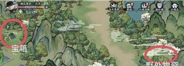 1、进入村子时,我们可以在上方树林找到藏宝图位置,然后再下面会依次有采集、试炼以及两个宝箱。