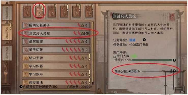 2、然后我们进入招贤堂的任务分配,把所有的弟子都分配到“测试凡人灵根”。