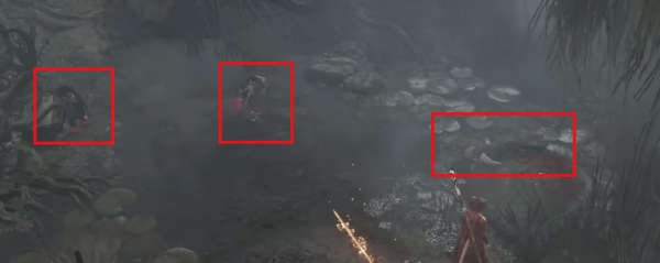 1、玩家来到游戏中的腐烂泥潭,可以看到有很多的红帽子妖精,以及倒在血泊中的德莱尔。