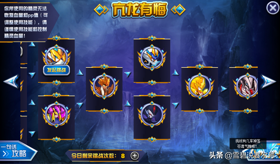 基本规则:允许携带20只精灵进入试炼,挑战过程中精灵无法回复PP和体力,每次最多使用6只精灵来挑战,通过9关即可通过本关,每天15次挑战次数,挑战过程中刷新则自动判定精灵死亡。