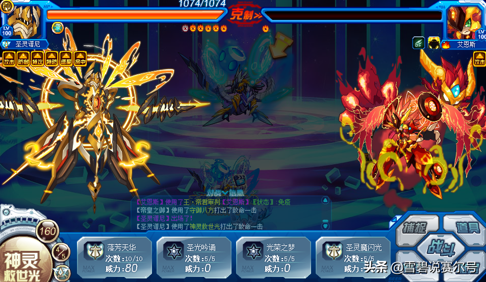 依旧是万能的圣谱,由于精灵只吃暴击,因此要强满放璀璨圣光加圣光气引爆再来击杀,不过如果被破防一定要及时补上防御防止翻车。