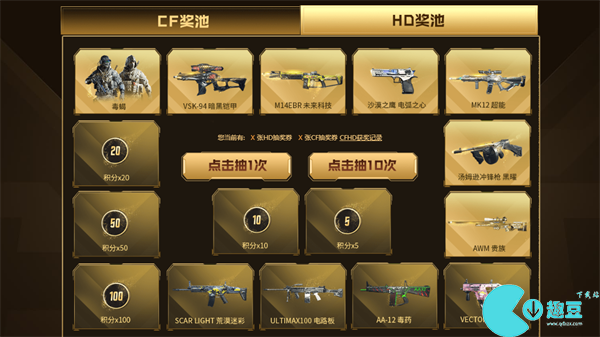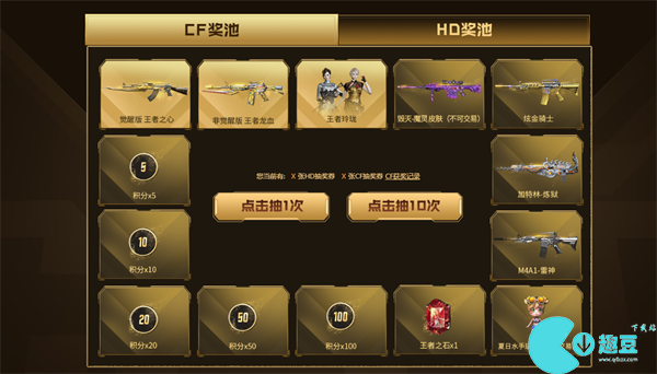 4、在目前的抽奖活动中,玩家可在CF奖池、HD奖池中自由选择抽取,每个奖池的奖励不同;