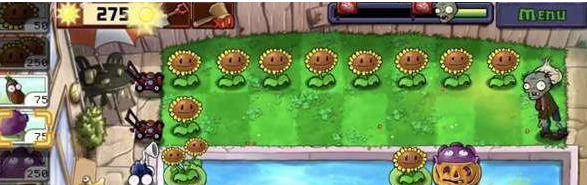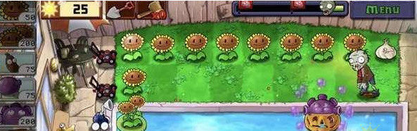 1、沿着底线及1、6路种向日葵,并在1-9及6-9种植大蒜。前三只僵尸均用土豆解决。