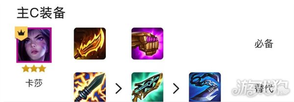 主C卡莎的必备装备是羊刀、珠光护手,替代装备是电刀、科技枪、巨杀。