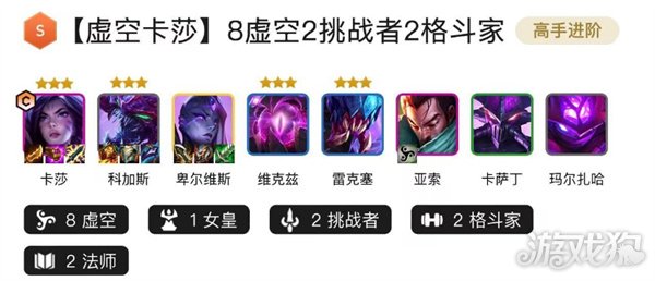 最强阵容是由卡莎、科加斯、卑尔维斯、维克兹、雷克塞、亚索、卡萨丁、玛尔扎哈组成。