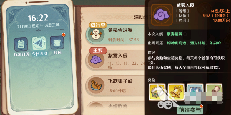 除了比较固定的玩法之外,游戏中增加了限时玩法,让玩家们在游戏中能够有更好的体会,限时活动现在是有4个的,分别是【东泉雪球赛】,【紫雾侵略】,【腾跃果子林】,【光耀联赛】,这几个是游戏中比较特别的本,玩家们最好是都参加进来,由于坠落的奖赏仍是比较丰富的。
