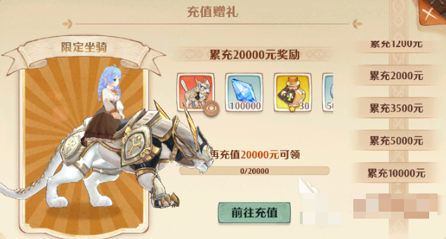 玩家们能够在活动页面找到特惠玩法,榜首栏中的【充值返利】中就能够看到充值界面了,界面右下方有一个充值赠礼,玩家们能够经过页面进行检查,最初始的阶层是从50元起充的,玩家们能够取得猫灵抽奖券,一起还有一些比较根底的猫灵晋级资源。而玩家们最关怀的【荣光之翼】获取的要求是需求玩家们充值金额累计到达1万元才能够取得的。