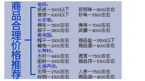 傲来国:帽子一3500左右、商品盐一5500以下、蜡烛一2000左右、商品酒一4000左右。