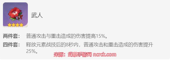 5、武人:两件套加四件套关于重击加成的效果有40%,做为前期的过渡圣遗物来说也是较为不错的选择。不过要注意的是目前武人圣遗物只有四星,没有五星,所以不要想着一直用哦。