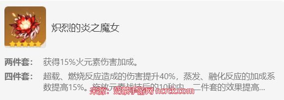 1、炽烈的魔女:不管是两件套还是四件套都适合胡桃,四件套的蒸发、融化反应加成系数提高15%对于胡桃来说是在合适不过了,其次魔女套做为胡桃的毕业圣遗物套装,大招的时候也是一个较重的比重。