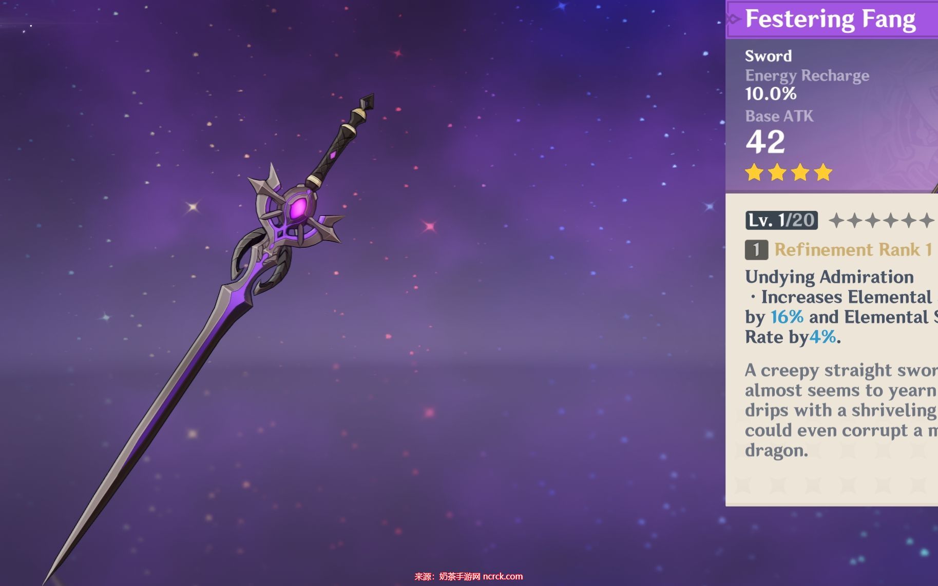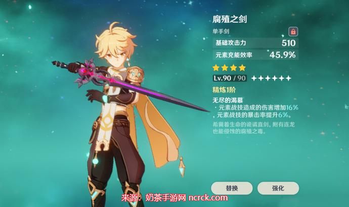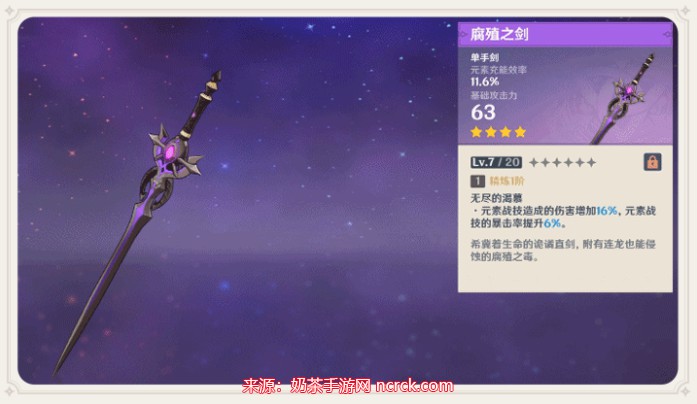 1、腐殖之剑是一把四星的单手剑,装备后能够提高玩家的元素战技伤害。